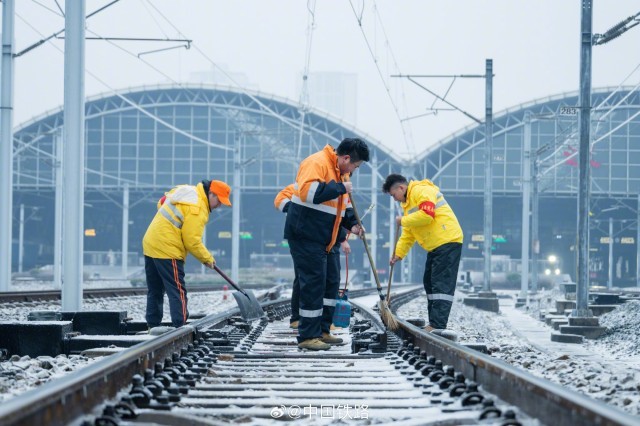 面对低温雨雪冰冻天气,为保障旅客列车运行安全,汉口站区联动车站、电务、工务等多家单位,组成多支党员突击队,不分昼夜,24小时轮流值守,持续对汉口站208组道岔等铁路信号设备进行检修巡视和扫雪除冰作业。 微博@中国铁路 图