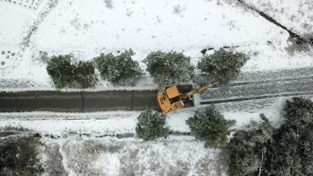 2月5日,挖掘机在湖南省临湘市坦渡镇清理路面积雪与倒伏树枝(无人机照片)。新华社记者陈振海 摄