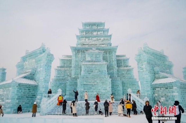 资料图:哈尔滨冰雪大世界内的冰雕吸引游客观看。中新社发 赵宇航 摄