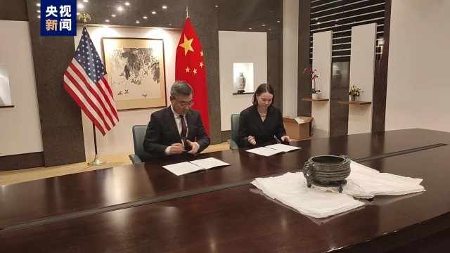 △国家文物授权我驻纽约总领馆总领事黄屏代表中方接收并暂存保管丰邢叔簋(驻纽约总领馆供图)