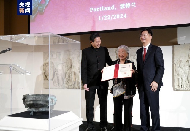 △我驻旧金山总领馆总领事张建敏代表国家文物局为雷蒙德·金及其母亲颁发捐赠证书(驻旧金山总领馆供图)