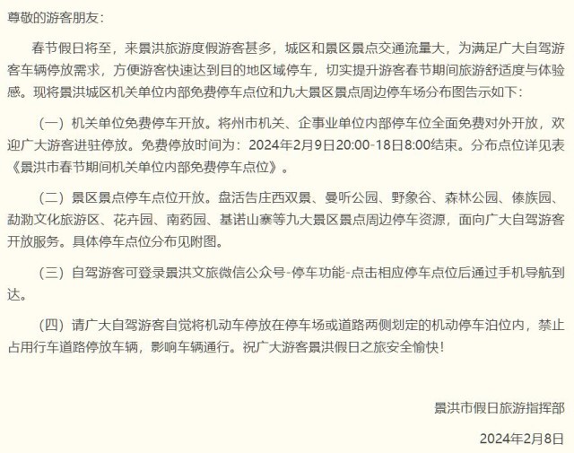 2月8日,云南西双版纳景洪市假日旅游指挥部发布公告,春节假日将至,来景洪旅游度假游客甚多,城区和景区景点交通流量大,为满足广大自驾游客车辆停放需求,方便游客快速达到目的地区域停车,切实提升游客春节期间旅游舒适度与体验感,景洪城区机关单位和九大景区景点周边停车场将免费开放。
