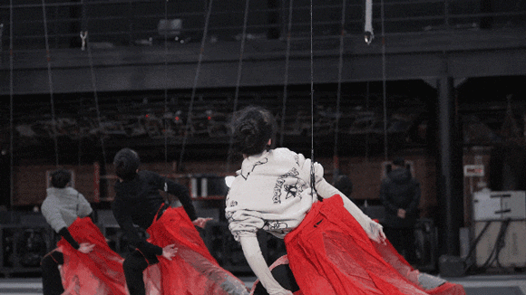 用领舞华宵一的话来说:“落地发力的时机错过0.01秒,我蹬地就借不住力量,身体就被威亚带走了。所以我要跟它抢时机,每一次发力都要非常精准。”跳《锦鲤》,要时时刻刻与绳索“沟通和对话”。