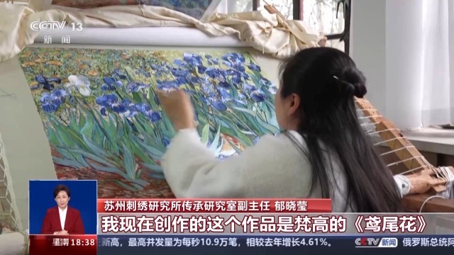 苏州刺绣研究所传承研究室副主任 郁晓莹:我现在创作的这个作品是凡·高的《鸢尾花》。用什么线,用多少颜色,线条的交叉角度是多少?这些微妙的变化出来的效果都是不一样的,其实苏绣并不是死板的,它也一直是在总结学习的一个过程,所以它才这么富有生命力。