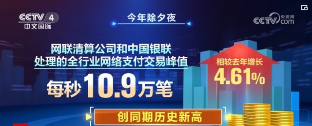 中国人民银行最新数据显示,2024年除夕夜,伴随着零点钟声的敲响,网联清算公司和中国银联处理的全行业网络支付交易达到峰值,最高并发量为每秒10.9万笔,相较2023年增长4.61%,创同期历史新高。