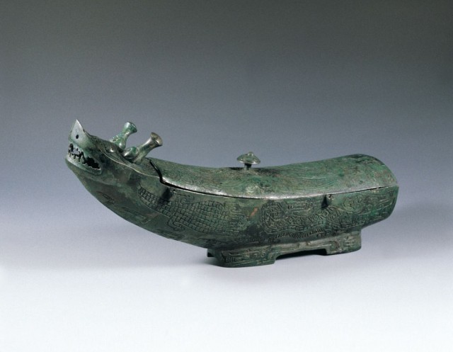 “商人好酒”。商代的青铜器中,酒器种类丰富。山西博物院有件60多年前出土于山西省石楼县的龙形觥,造型别致、纹饰精美,通高17.7厘米,通长42.5厘米,重4310克,容积1620毫升。与一般青铜觥将兽头装饰在器盖的前端、后部有鋬的情况不同,它更像一只龙舟。