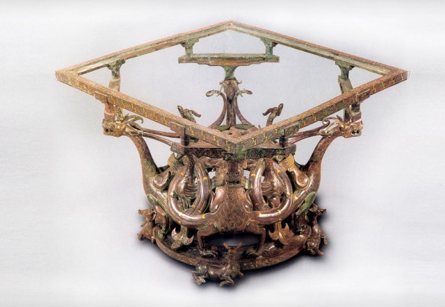 酒器需要桌来配。在河北博物院,有一件战国时期的错金银四龙四凤铜方案,1977年出土于河北平山县三汲村一战国古墓。它通高36.2厘米,重18.65公斤,底盘由4只梅花鹿承托,底盘之上挺立着4条神龙。在龙身蟠环纠结之间,凤鸟引颈长鸣、展翅欲飞,整体造型动静结合,可谓龙飞凤舞、新颖奇特。