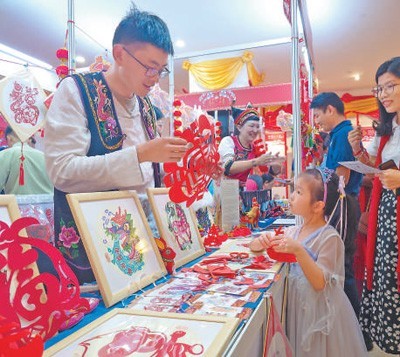 日前,在缅甸仰光举办的“欢乐春节·新春集市”活动现场,工作人员在展示剪纸作品。本报记者 谢佳君摄