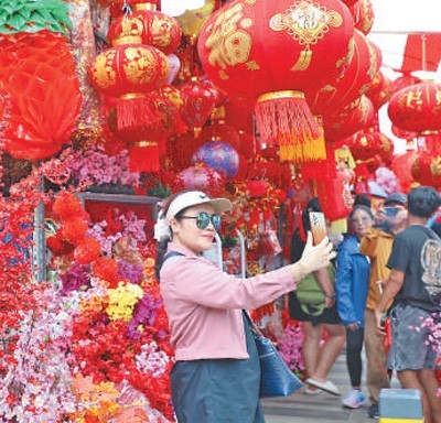 春节期间,印度尼西亚首都雅加达的中国城一派喜庆气氛。图为当地市民在街边商铺自拍。本报记者 曹师韵摄