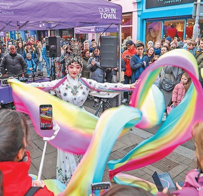 2月11日,2024年爱尔兰“欢乐春节”活动在首都都柏林开幕。图为川剧《天女散花》表演。赵天宇摄