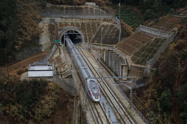 扫山作业过程中,高铁列车穿越郑家坞隧道。受访者供图
