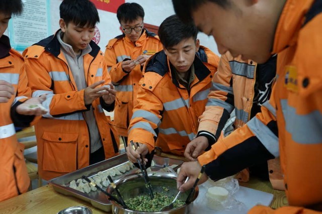 今年2月2日,工长吴飞墙特意安排春节假期即将值守的小伙子们在小年夜提前吃团圆饭,大家聚在一起包了饺子。