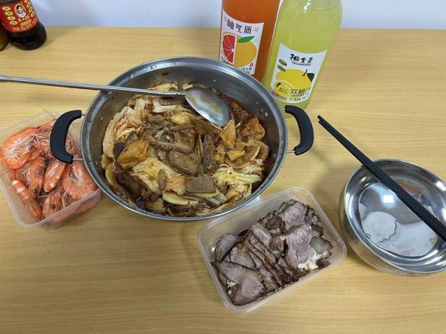 “祝我们一屋,两人,三餐,四季平安,新年快乐!”晚上7点,陈汛举起手中的饮料庆祝新年的到来。这个除夕,陈汛和同事魏修文在黟县东站值守点度过。牛杂火锅、白灼虾、酱牛肉三个菜便是两个小伙子的年夜饭。