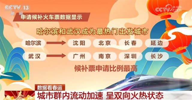 从申请候补火车票的热门城市看,哈尔滨和武汉延续昨天的热度,继续成为今天候补票里最热门的出发城市,从哈尔滨到沈阳、北京、长春、延边,从武汉到广州、南京、深圳、长沙的候补票的申请比例最高。提醒有候补票需求的旅客,合理安排出行。