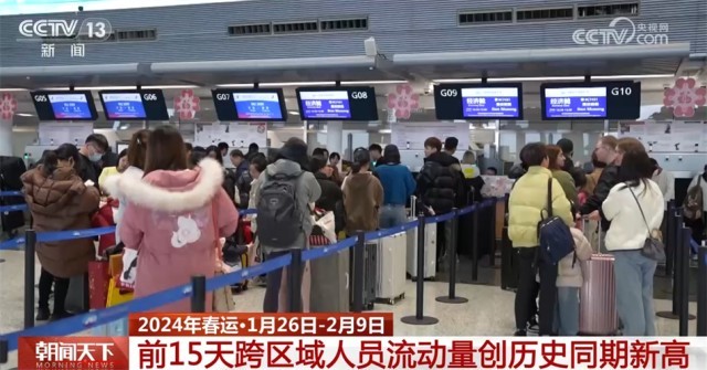 交通运输部发布数据显示,春运节前15天(1月26日—2月9日),全社会跨区域人员流动量达31.1亿人次,日均20721万人次,较2023年同期增长12.5%,较2019年同期增长6.2%,创历史同期新高。