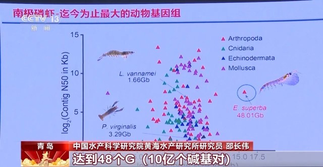 中国水产科学研究院黄海水产研究所研究员 邵长伟:我们发现这个南极磷虾整个基因组的大小达到48个G(10亿个碱基对),这是个什么概念?我们人类的基因组才3.2个G(10亿个碱基对),南极磷虾,虽然个儿很小,但它的基因组却那么大,所以,这是一个很有意思的现象。