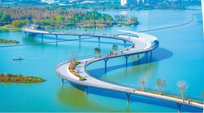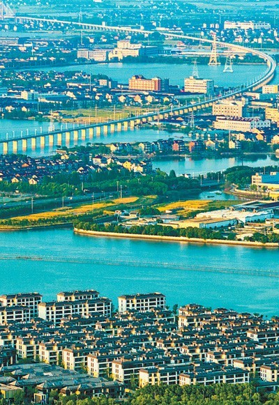 示范区加强生态环境综合治理,以太浦河、淀山湖、元荡、汾湖“一河三湖”为重点,大力推进岸线综合整治。图为横跨沪苏两地的元荡慢行桥。