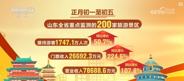 正月初一至初五,山东全省重点监测的200家旅游景区,累计接待游客超过1747万人次,门票收入超2.6亿元,营业收入超7.8亿元,与上年同期相比,分别增长50.7%、224.6%、107.8%。