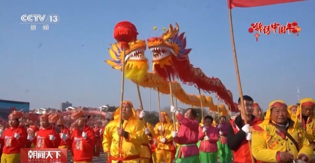 大年初五上午,江苏泗阳上演了一场“龙腾虎跃贺新春”的传统民俗展演活动,伴随着喜气洋洋的锣鼓声,来自全县13个乡镇街道的千人展演队伍集合巡游,舞龙、舞狮、花船、跑驴、马灯、大头娃娃等一个个极具特色的传统民俗表演轮番上演。