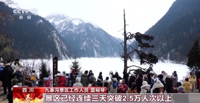 九寨沟景区工作人员 雷裕琴:从12日开始,景区已经连续三天突破2.5万人次以上,特别是13日已经突破了3万,这在春节假日接待历史上是绝无仅有的。
