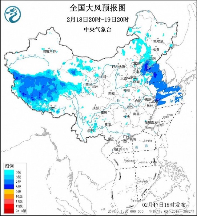 预计,2月17日20时至18日20时,新疆北疆东部和南疆盆地、西藏中西部、青海西部和北部、甘肃河西、内蒙古中西部、吉林西部等地将有5~7级、阵风8~9级的大风。