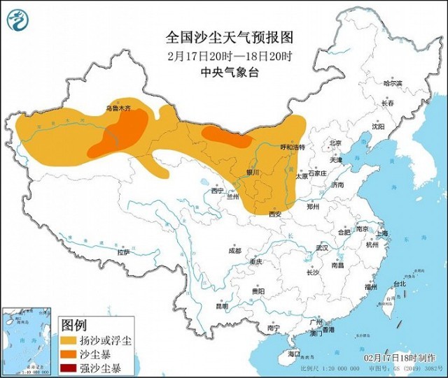 央视网消息:中央气象台2月17日18时继续发布沙尘暴蓝色预警。受冷空气大风影响,预计2月17日20时至18日20时,新疆东部和南疆盆地、内蒙古中西部、甘肃中北部、宁夏、陕西中北部、山西西部等地的部分地区有扬沙或浮尘天气,新疆东部和南疆盆地东南部、内蒙古西部局地有沙尘暴。