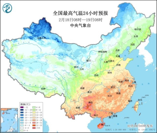 预计2月18日08时至20日08时,新疆南疆盆地、内蒙古大部、西北地区东部、华北北部、东北地区、黄淮、江淮、江汉、江南北部等地将降温6~10℃,其中,南疆盆地西部、内蒙古大部、东北地区大部等地降温12~16℃,局地可达18℃以上。