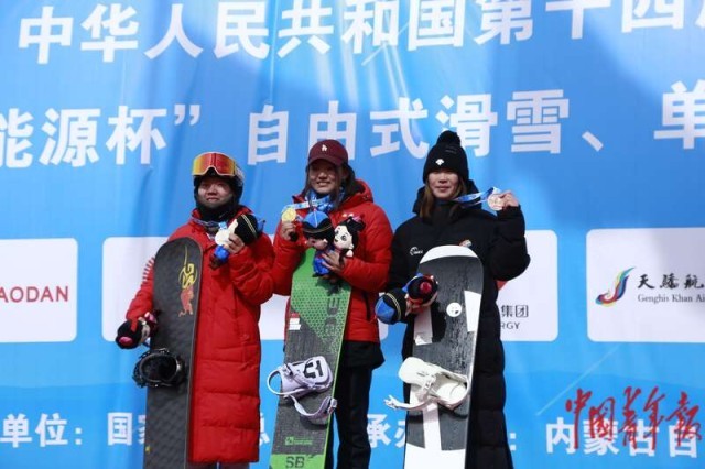 西藏队选手拥青拉姆(中)、湖北队选手杨礼妍(左一)和辽宁队选手冯贺(右一)分获单板滑雪障碍赛青年组前三名。中青报·中青网记者 石佳/摄