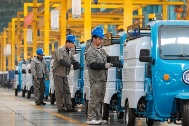 2月17日,在安徽省芜湖市繁昌经济开发区爱瑞特新能源专用汽车生产车间里,工人组装新能源电动清扫车。新华社发(肖本祥 摄)
