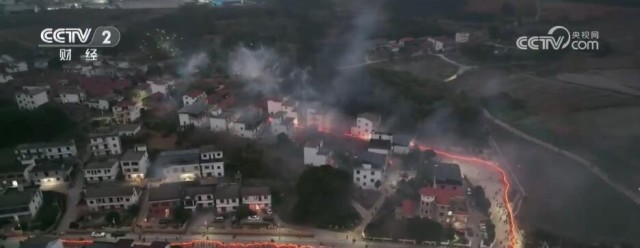 傍晚时分,一条由400名村民共同组成近500米的“板灯龙”正式起龙。伴随着铿锵锣鼓声,村民们身穿统一服装,扛着“板灯龙”围着村子道路走家串户。走到哪家,烟花爆竹便响成一片。