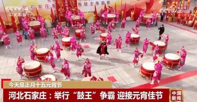 在河北石家庄,14支民间鼓队的一千余名表演人员,通过鼓王争霸的方式迎接元宵佳节。这些民间鼓乐演员挥动着手中的鼓槌,把一个个汇集民间鼓乐精华的节目奉献给现场观众,为大家在新的一年讨一个红火热闹的好彩头。