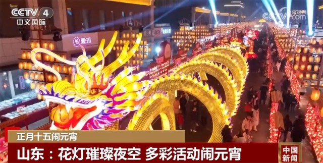 在山东济宁金乡县,一场璀璨的灯光盛宴正在上演。以龙腾新春、瑞龙送福等龙元素为主题的花灯,成为了众多市民游客争相拍照打卡的焦点。在山东聊城,舞龙舞狮队伴着欢快的鼓点尽情起舞,社区居民欢聚一堂,猜灯谜、煮汤圆,感受元宵节的喜庆氛围。