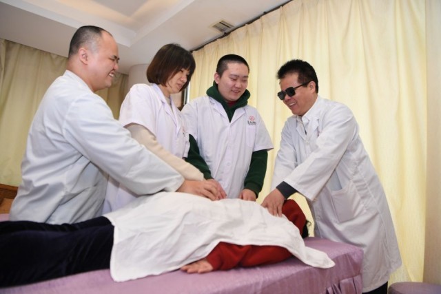 王永澄(右一)在福州市海峡盲人按摩指导中心为盲人朋友传授盲按要领(2月6日摄)。