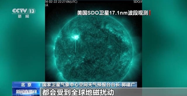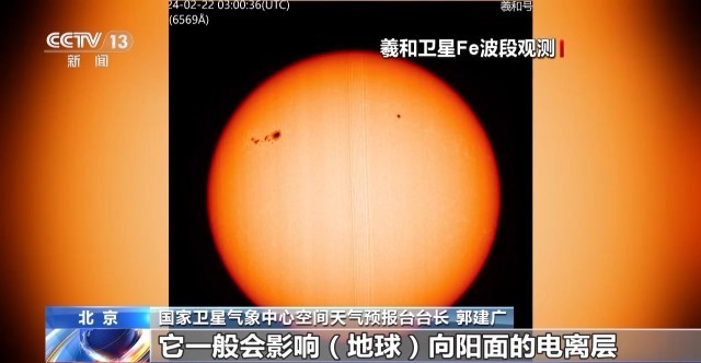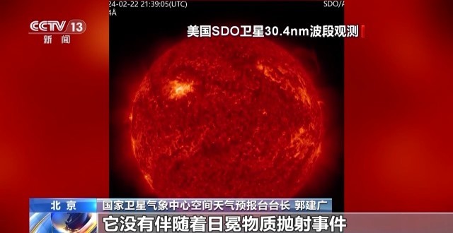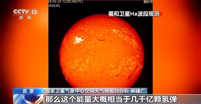 国家卫星气象中心空间天气预报台台长 郭建广:太阳耀斑我们一般是指(太阳)大气层中突然增亮的现象,一般它也伴随着大量的能量释放,这个能量大概相当于几千亿颗氢弹同时爆炸的能量。
