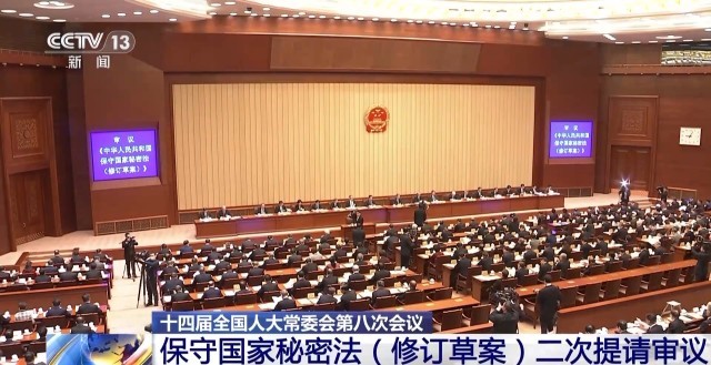 十四届全国人大常委会第八次会议今天(26日)上午在北京人民大会堂举行第一次全体会议。保守国家秘密法(修订草案)二审稿提请审议。草案二审稿完善确定保密事项范围的原则,进一步规范定密权限等内容。