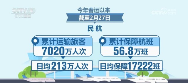 1月份,民航全行业完成运输总周转量116.1亿吨公里,同比增长57.1%;完成旅客运输量5731.8万人次,同比增长44.1%,民航客运恢复程度达到疫情以来月度新高;完成货邮运输量75.3万吨,同比增长53.9%,民航货运规模连续六个月超过疫情前水平。从数据看,今年春运以来,截至2月27日,民航累计运输旅客7020万人次,日均213万人次;累计保障航班56.8万班,日均保障17222班。
