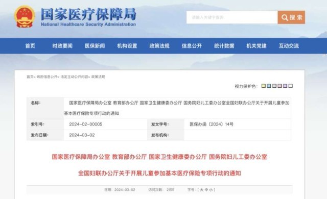 中国青年报客户端北京3月2日电(中青报·中青网记者 余冰玥)记者从国家医疗保障局官网获悉,今天,国家医保局、教育部、国家卫生健康委等五部门发布通知,开展儿童参加基本医疗保险专项行动。通知指出,要切实提高儿童参保率,力争到2024年底,80%以上新生儿在出生当年参保。到“十四五”期末,儿童参保率稳中有升。