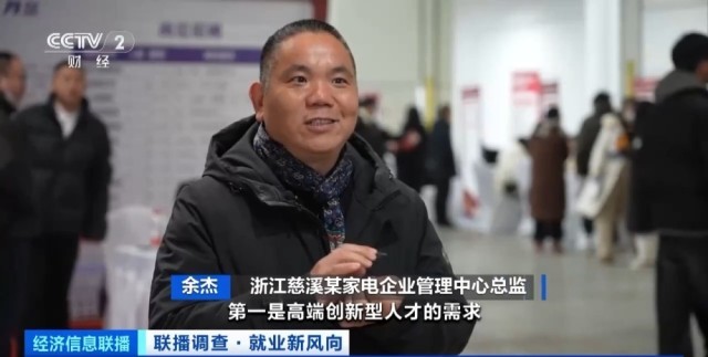 浙江慈溪某家电企业管理中心总监 余杰:第一是高端创新型人才的需求,第二是一线产业工人的需求。接下来几年,我们企业对智能化、数字化的人才有大量需求,市场很欠缺。