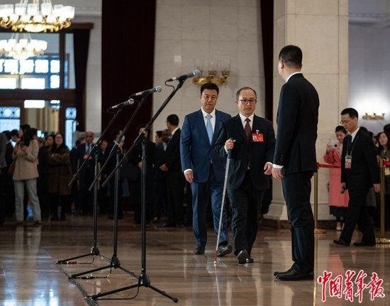 3月4日下午,在人民大会堂,全国政协十四届二次会议首场“委员通道”开启,全国政协委员、中国残联理事、中国盲人协会主席李庆忠手持盲杖走上“委员通道”,接受记者提问。中青报·中青网记者 李峥苨/摄