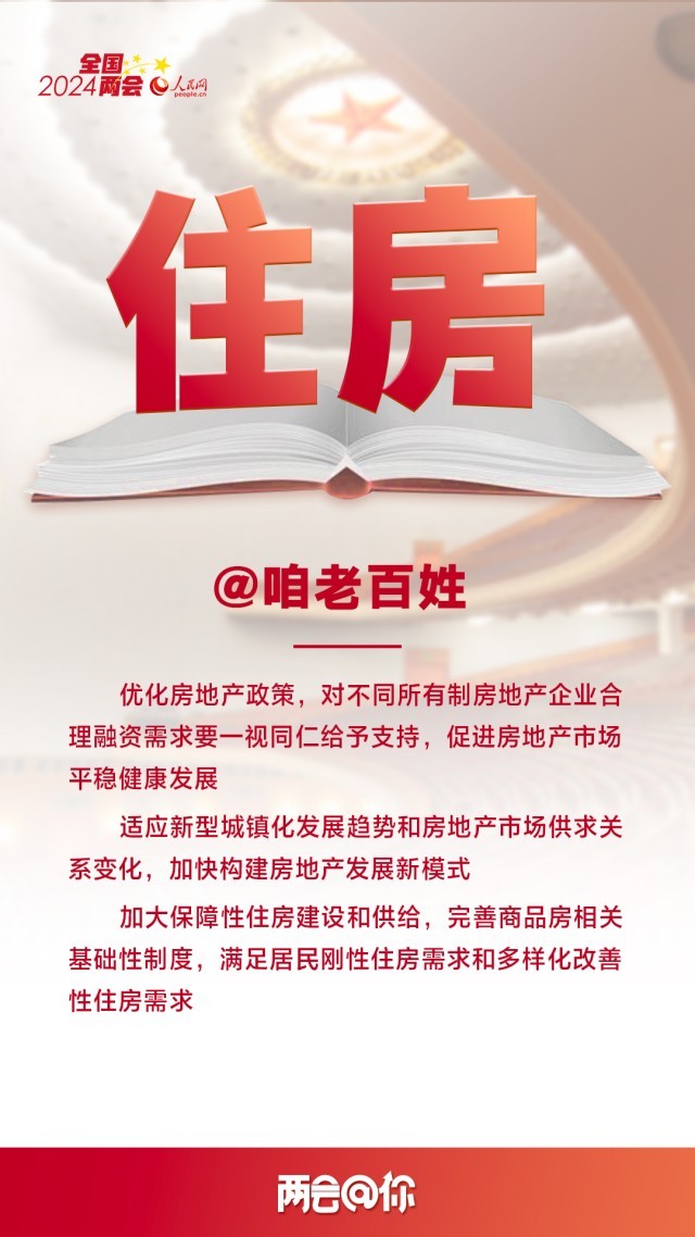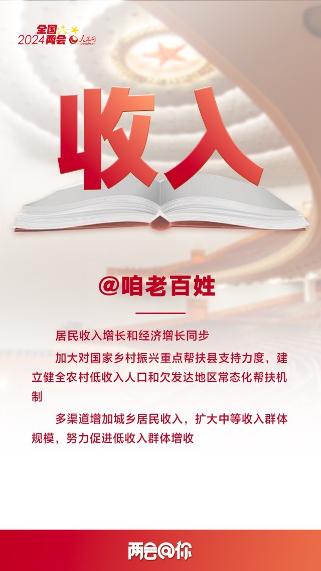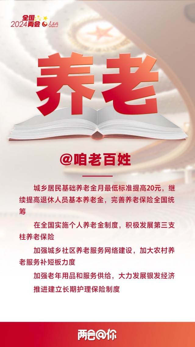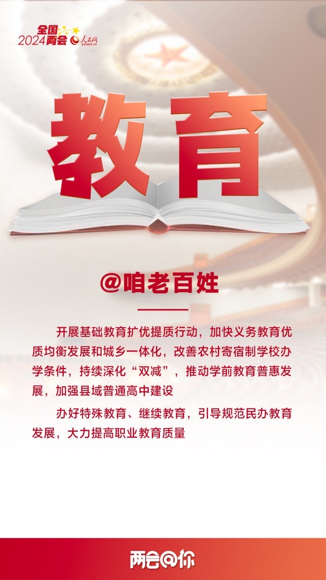 编者按:3月5日,十四届全国人大二次会议开幕,国务院总理李强代表国务院向大会作政府工作报告,提出2024年经济社会发展总体要求和政策取向。即日起,人民网推出“两会@你”系列报道,聚焦与百姓生活息息相关的热点议题,梳理解读全国两会上的重要民生看点,以飨读者。