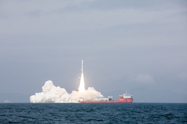 2024年2月3日11时06分,我国太原卫星发射中心在广东阳江附近海域使用捷龙三号运载火箭,成功将DRO-L星、智星二号A星、东方慧眼高分01星、威海壹号01-02星、星时代-18-20星以及NEXSAT-1星等9颗卫星发射升空,卫星顺利进入预定轨道,发射任务获得圆满成功。新华社发(安迪 摄)