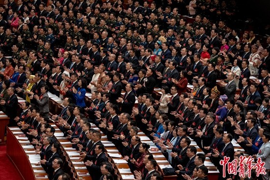 3月5日,北京人民大会堂,十四届全国人大二次会议第一次全体会议,代表们起立鼓掌。当日上午9时,十四届全国人大二次会议在北京人民大会堂开幕,大会听取国务院总理李强关于政府工作的报告。中青报·中青网记者 李隽辉/摄