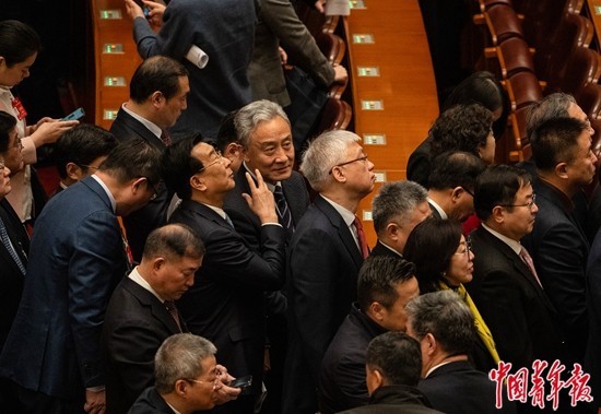 3月7日,北京人民大会堂,全国政协十四届二次会议第二次全体会议结束后,参会委员在退场时相互交流。中青报·中青网记者 李峥苨/摄
