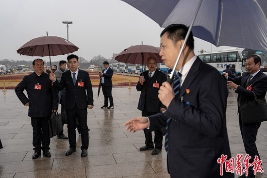 3月5日上午,北京人民大会堂外,十四届全国人大二次会议开幕会举行前,代表们冒雨赴会。中青报·中青网记者 李隽辉/摄