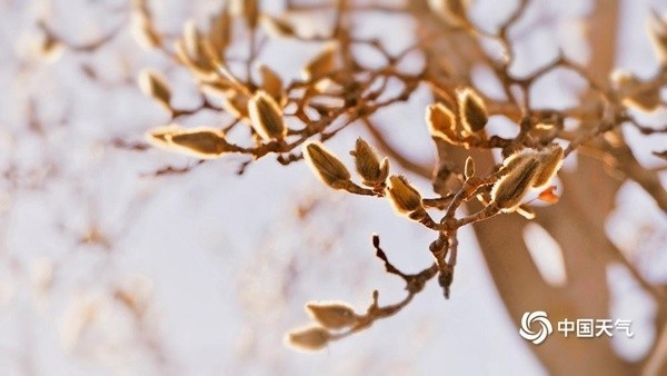 3月8日,北京街头的玉兰花已经长出花苞,在阳光的照耀下,毛绒绒的,让人不禁期待满树繁花。(图/中国天气网 王晓)