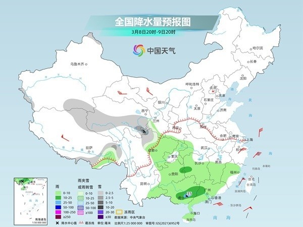今天晚上,新一轮降水将从西南地区东部发展起来,明后两天,江南大部等地也将加入到降水的行列之中,预计广西中东部、广东中北部、湖南中南部、江西中南部、福建西部等地将会有中到大雨天气,广西东部、广东西北部等地部分地区还可能出现暴雨,部分地区还会伴随对流天气。