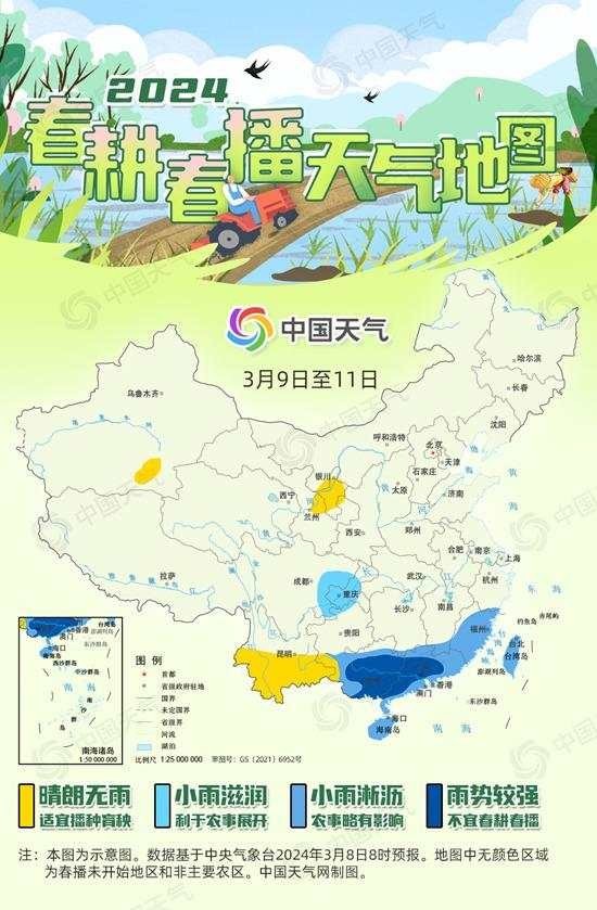 中国天气网气象分析师李靓介绍,3月9日至11日,广西西部、广东东部和北部、福建大部、海南岛等地小雨淅沥,对田间作业略有影响。广西东部、广东西部和中部有2至3天中雨,部分地区甚至将有大雨或暴雨,对春耕春播作业影响较为明显。