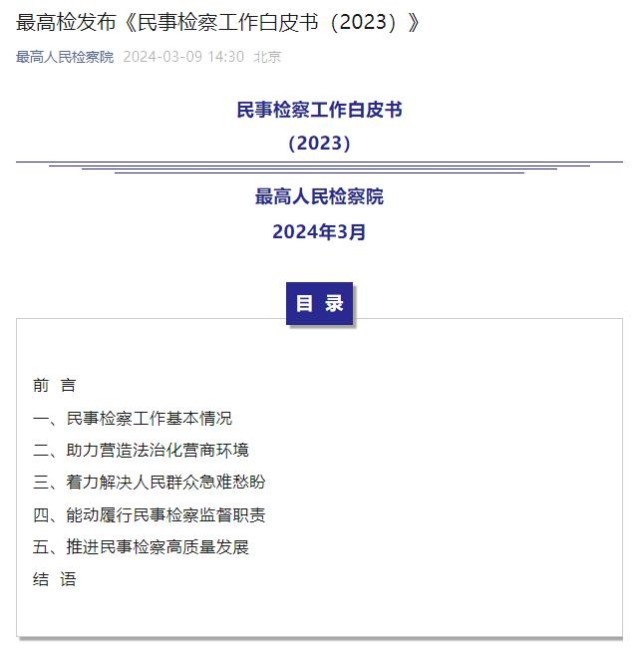 检察机关不断健全工作机制,完善民事检察监督制度体系,强化矛盾纠纷实质性化解,加快推进民事检察工作现代化,助推民事检察工作高质效发展。