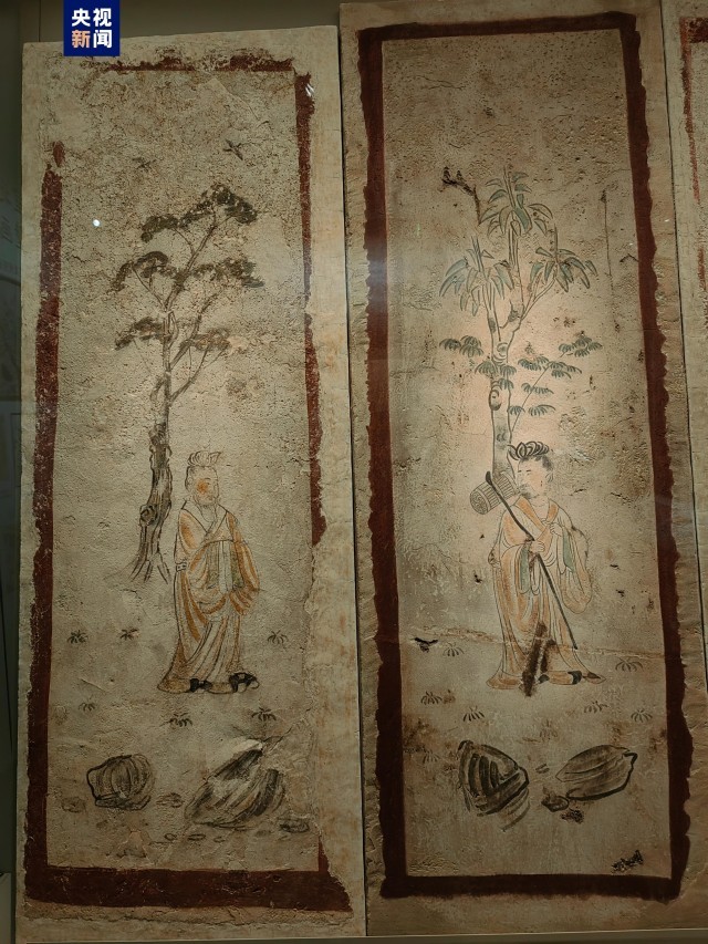 此次展出的壁画包括拱手仕女图、高士图、山水图、朱雀图、玄武图、乐舞图等,其中发现于韩休墓室北壁东侧的山水图,是我国迄今所见最早的古代独幅山水壁画,将我国绘画史上独幅写实山水的历史从宋代提前到了唐代;东壁的两组歌舞伎乐共舞图,完整再现了唐代乐舞的场景,对中国古代乐舞研究具有重要意义,开创了同类题材的新篇章。