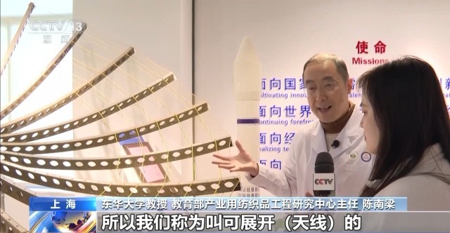 东华大学教授、教育部产业用纺织品工程研究中心主任 陈南梁:我们火箭发射上去的时候,它是缩在火箭里面的。然后到了轨道以后,它通过展开机构把卫星反射面慢慢展开成这么一个大型的、网状的天线,所以我们称为可展开天线的,它是柔性的,所以我们要通过纺织的编织技术来形成这么一个布面,这样的话它是柔软的。